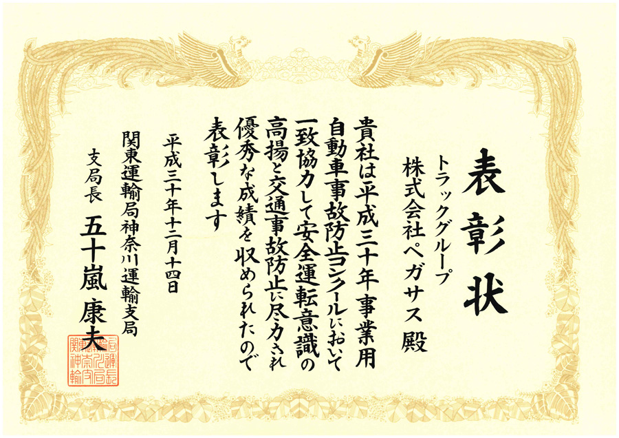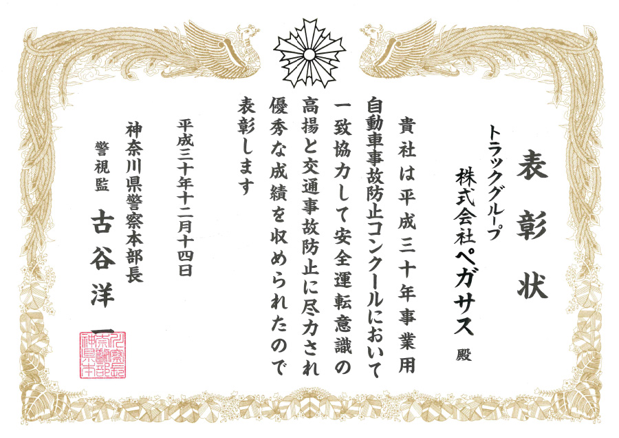 平成30年度事業用自動車事故防止コンクールに於いて「関東運輸局神奈川運輸支局長表彰」及び「神奈川県警察本部長表彰」を受賞しました。 |