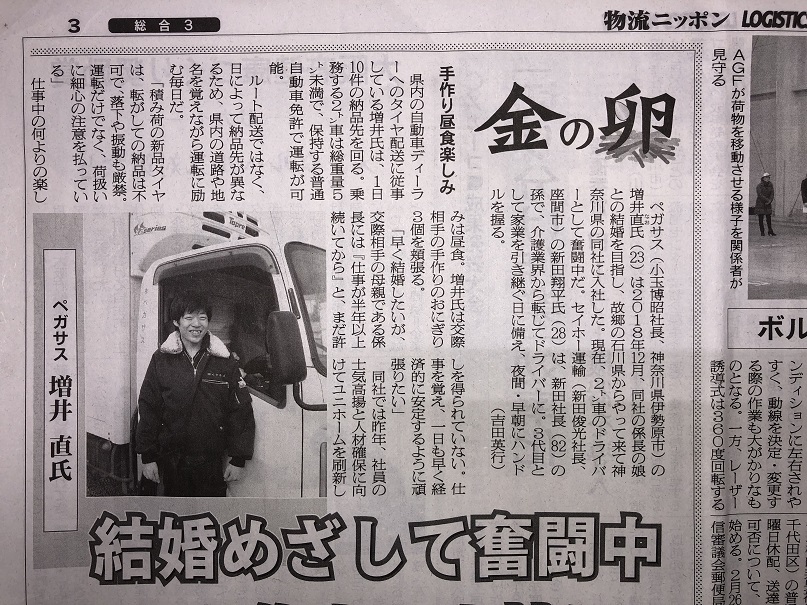 物流新聞「物流ニッポン」の取材を受け、この度「金の卵」というコーナーにて2019年3月5日付で掲載されました。 |